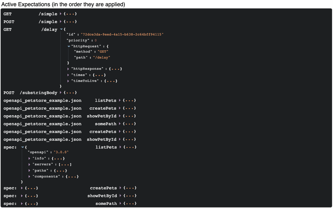 The active expectations section shows all active expectations in the order they are applied, taking into account all factors such as when the expectation was created, its priority, its timeToLive and its times